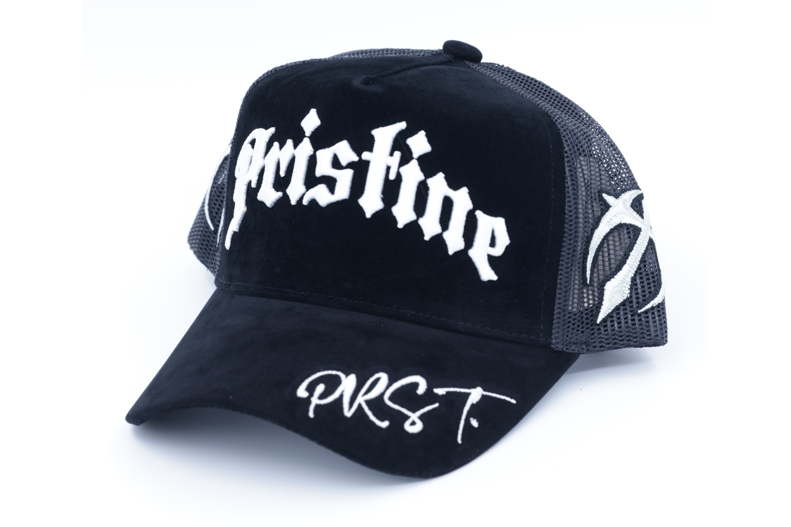 Elevate your everyday look with this premium black suede trucker hat, crafted for a perfect blend of comfort and statement style. The front panel features a bold 3D-embroidered Pristine logo, delivering depth and texture you can feel. A custom cross-logo patch adds a refined edge, while the breathable mesh back and adjustable snap closure ensure a flawless fit for all head sizes.